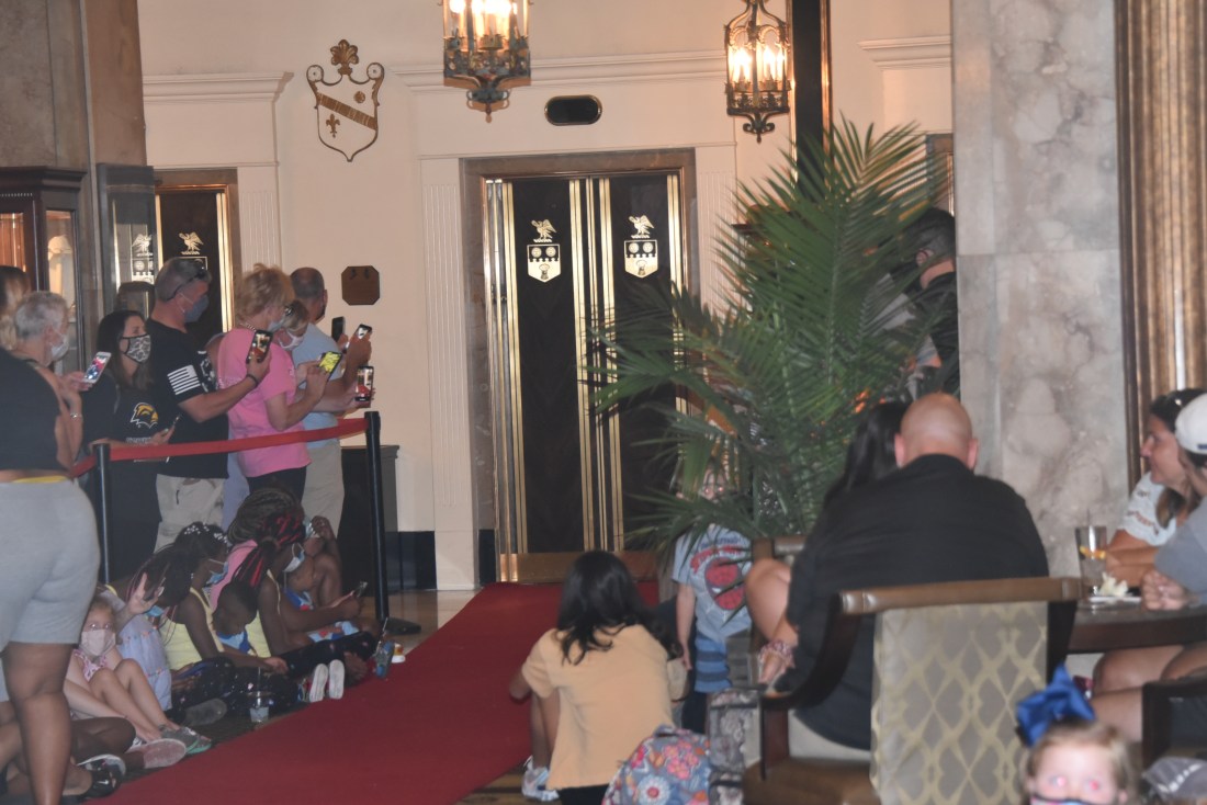 Here they are! The “World Famous Peabody Hotel Ducks”, getting out of the elevator from the penthouse, walking the red carpet and plopping into the fountain to the cheer and applause of the crowd. Yes, we wore masks and practiced social distancing!
