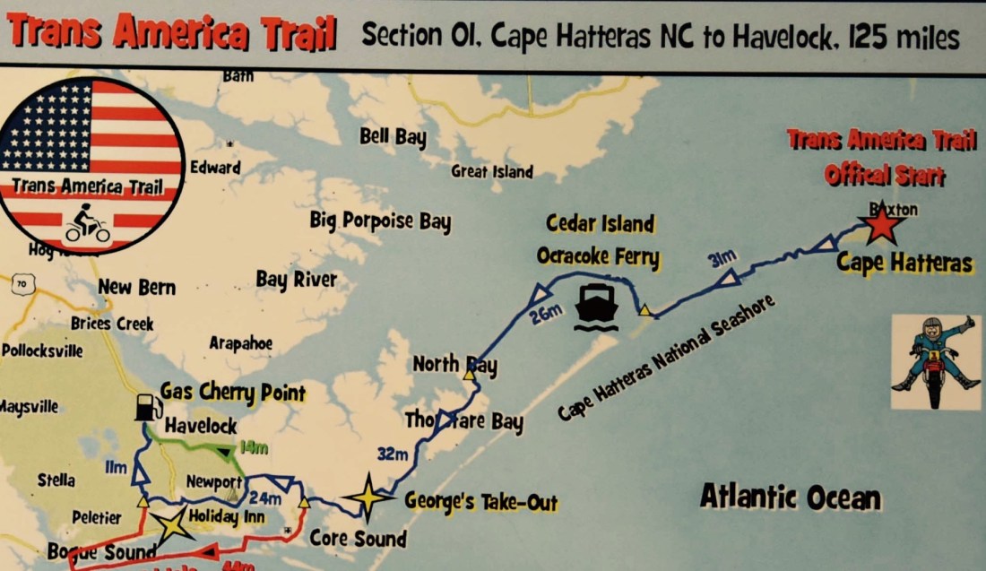 The Trans America Trail or TAT is a roughly 5,200 mile (8,000 km) cross continent vehicular route, intended to be a way to cross the United States using a minimum of paved roads for leisure, traveled by dual-sport motorcycles, off-road vehicle, or touring bicycle. The eastern portion of the route mainly consists of farm roads and forestry tracks which become more severe toward the Southern Rocky Mountains where it covers several high passes. The desert of Utah follows, then Sawtooth National Forest of Idaho and Deschutes National Forest.