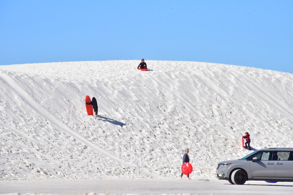 Just like snow, without the cold and wet! You can purchase the sledding gear at the visitor center. Humans disrupt the big beautiful dunes, and a little wind erases all tracks. It’s really fine, like sand in an hourglass.