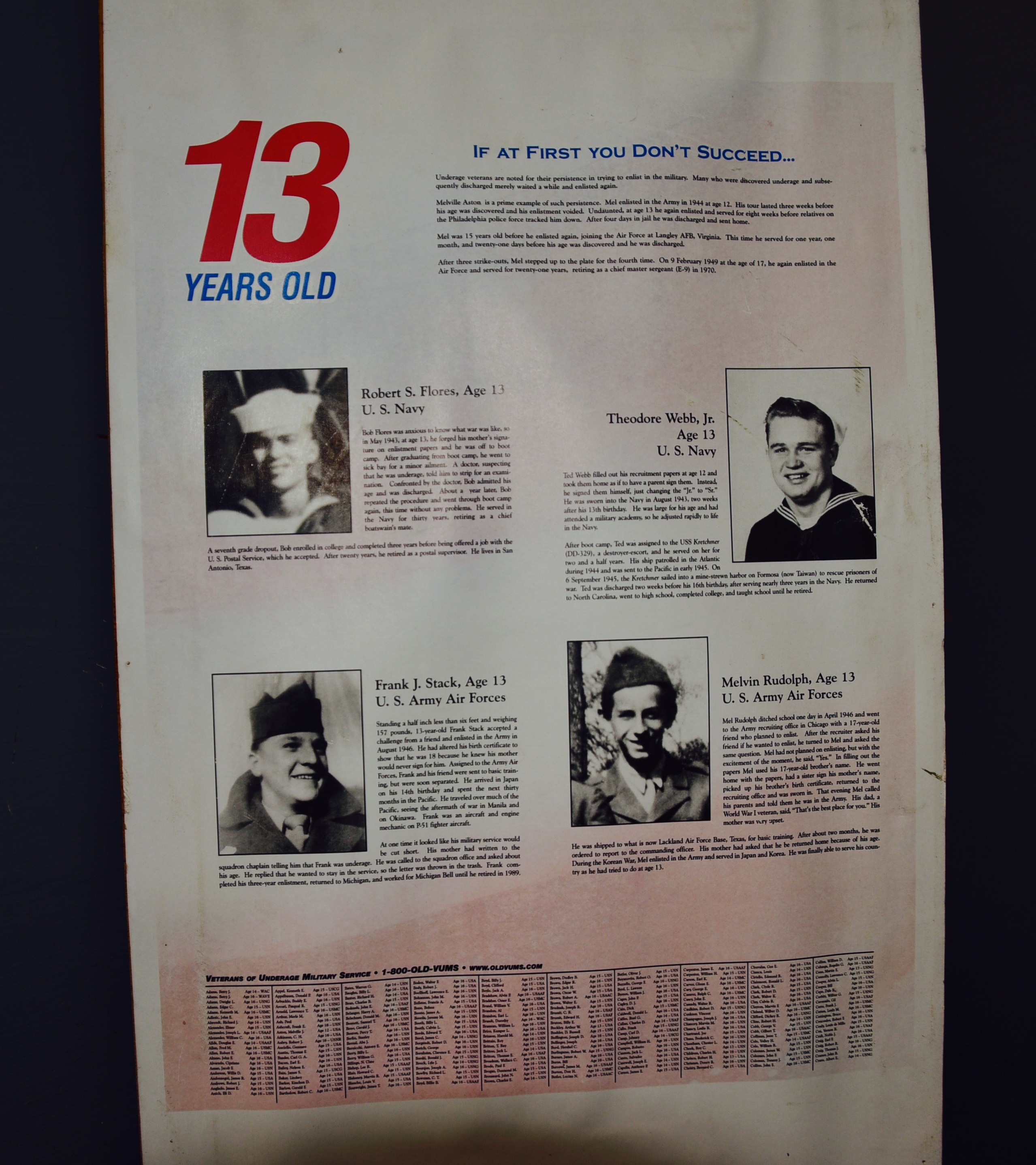 This is unbelievable! There was a large display containing the stories and accomplishments of underage military men and women in World War 2. (just boys and girls!) Most had lied about their age, but some were signed up by their parents where age wasn’t questioned. The youngest we saw was was twelve. One 13 year old went on to become an admiral in the Navy.