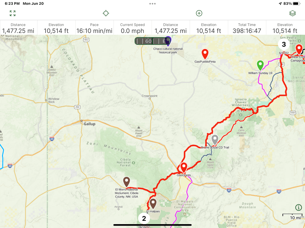 For those who asked, here are screenshots of our ACTUAL tracks laid over the keven.gps tracks. Our tracks are the heavy red lines. The numbered points are where we camped nights 1 through 6. Questions??