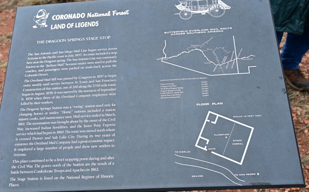 Dragoon Springs was one of these sources, and a station was constructed near the springs in August 1858. The heavily fortified station consisted of a 3 foot thick, 10 foot high stone wall, 45 feet by 55 feet enclosing the site, with two small rooms inside the enclosure. The stock was corralled within the walls.