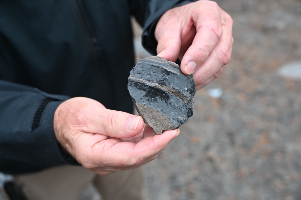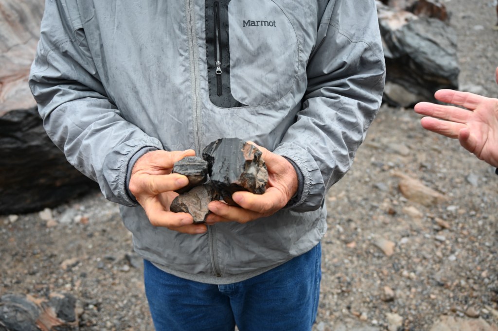 Rhyolitic volcanoes are characterized by having large amounts of silica (quartz) in their lava. The content of silica at Panum is about 76 percent. It makes the lava very viscous, or thick, and very glassy. Products of this rhyolitic eruption are pumice and obsidian, the volcanic glass that Native Americans used to make arrow points and scrapers.[6