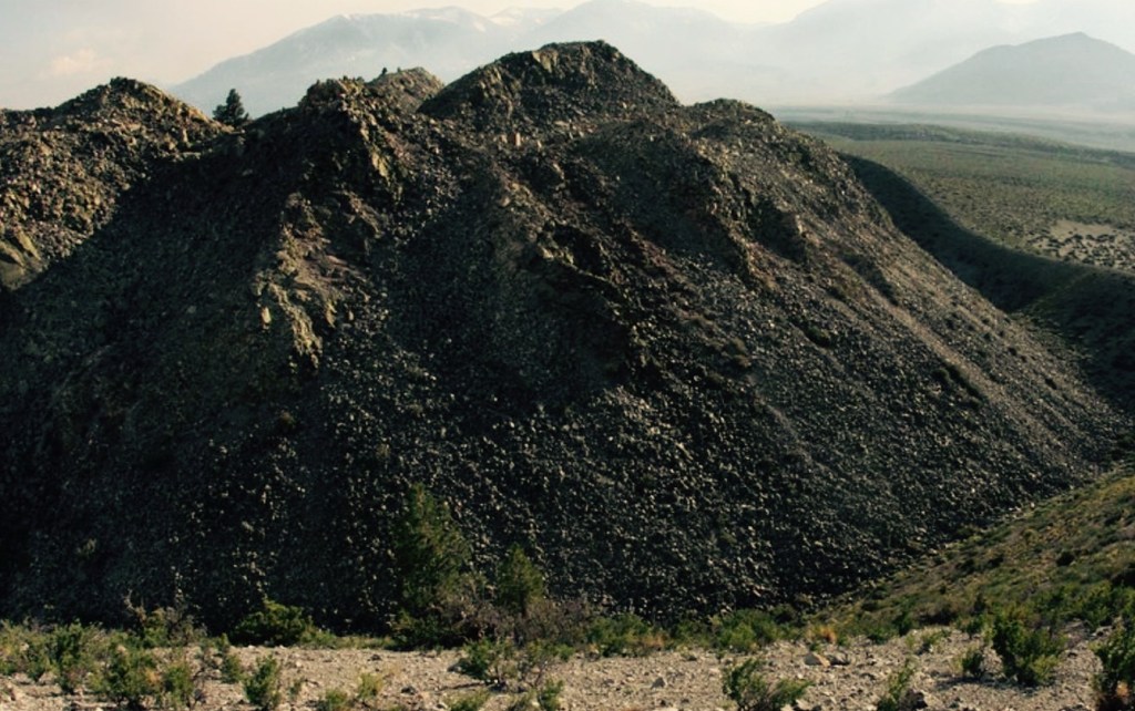 ObsidianDome is a mile-long 300 foot high lava dome formed less than half a million years ago when magma cooled rapidly’ Essentially it is a big pile of shiny black volcanic glass. It is located about 8 miles north of Mammoth Lakes, just south of June Lake, off of Hwy 395.